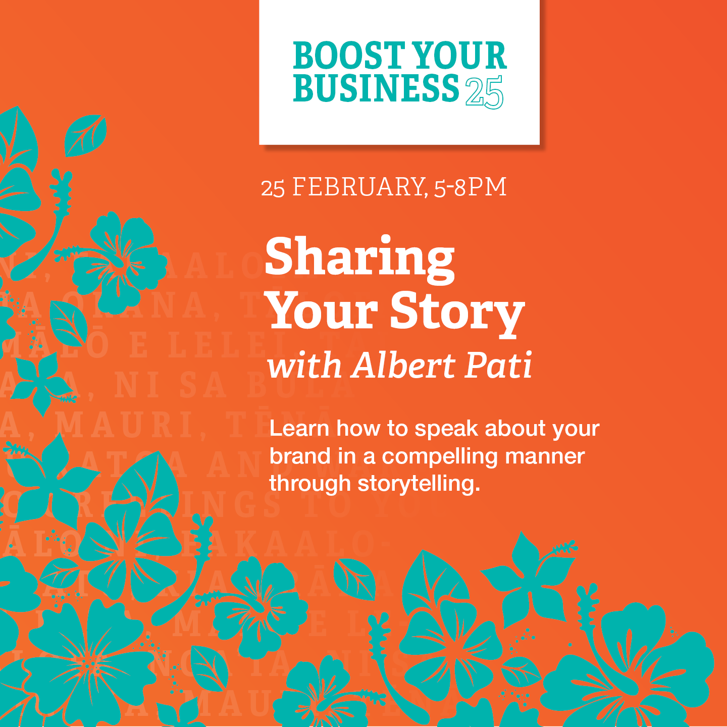 Boost Your Business workshops in WELLINGTON: Storytelling delivered by Albert Pati Date: 25th February Time: 5pm – 8pm Where: Pātaka Art + Museum, Porirua For more information or to register, click here!